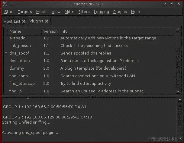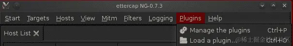 下一步是从“插件”选项卡中激活 DNS 欺骗插件,选择“管理插件”,如下面的屏幕截图所示: