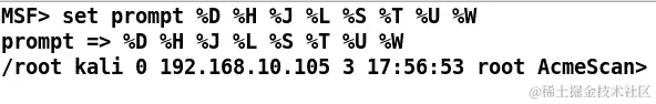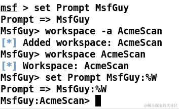 在您喜欢的渗透测试框架上工作并拥有您的提示符是多么酷?非常容易,我会说。要在 Metasploit 中设置您的提示符,您只需要将提示符变量设置为您选择的任何内容。撇开乐趣,假设您倾向于忘记当前使用的工作区,您可以使用数据库变量%W的提示符,以便轻松访问,如下面的屏幕截图所示: