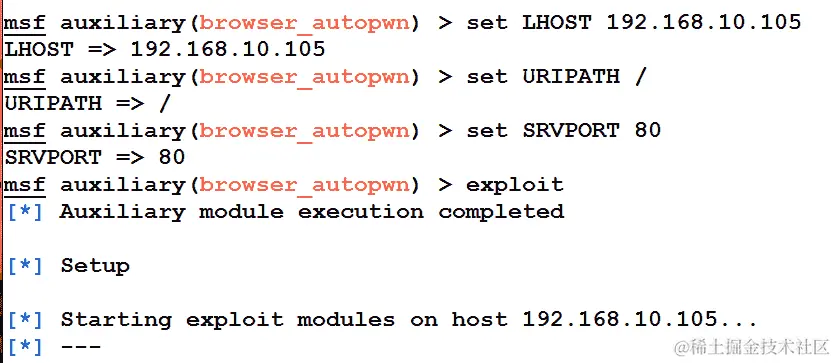 启动browser_autopwn模块将设置浏览器利用处于监听模式,等待传入连接,如下截图所示: