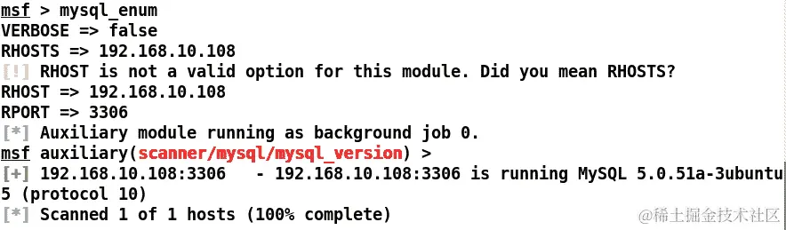 丰富!我们可以看到目标主机上有 MySQL 服务。让我们使用mysql_enum命令如下:
