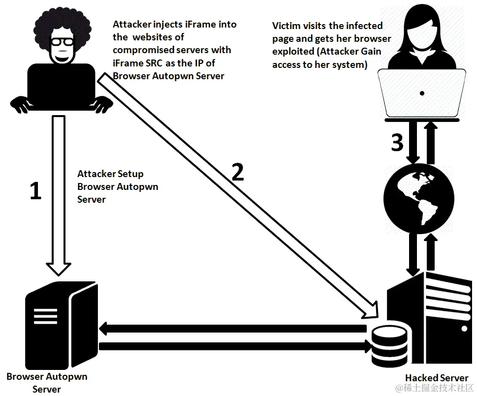 让我们通过以下图表了解如何使用浏览器利用来黑客攻击网站用户: