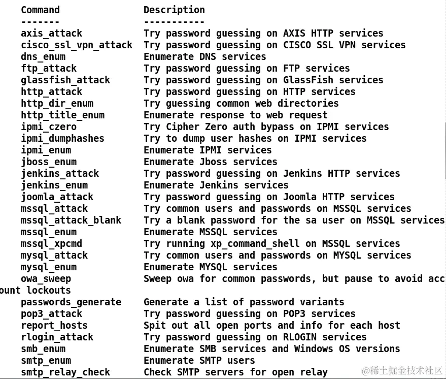 因为db_nmap扫描已经填充了大量结果,让我们看看启用了哪些minion选项可以使用:
