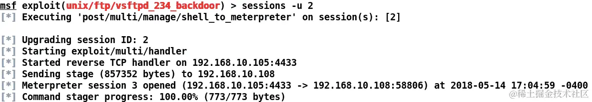 正如我们所看到的,我们已经打开了一个命令 shell,拥有类似 Meterpreter 提供的更好控制访问总是令人满意的。在这种情况下,我们可以使用-u开关升级会话,如下截图所示:
