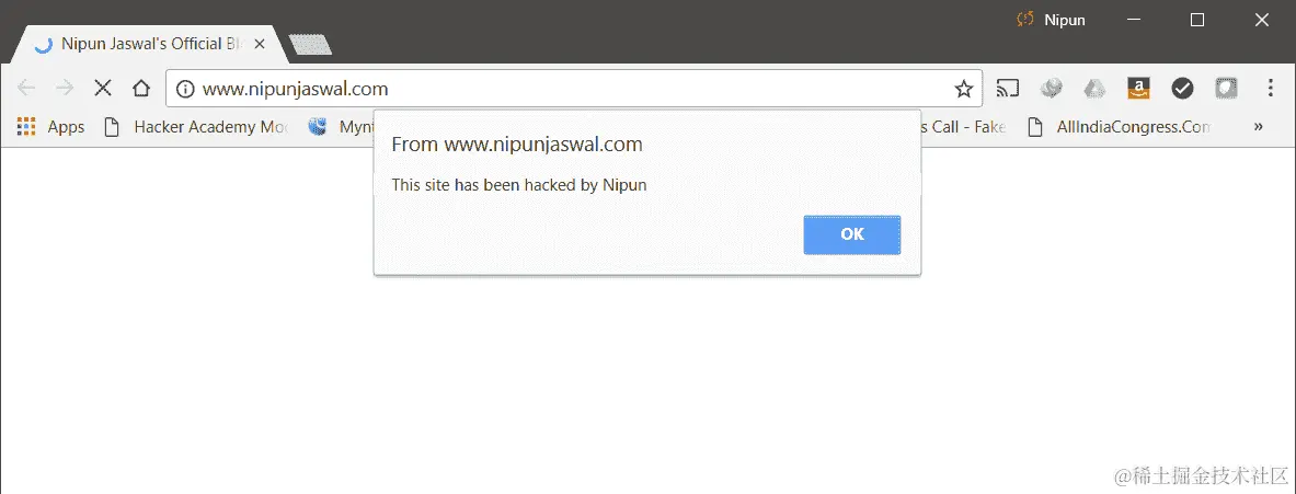 我们将使用自定义脚本攻击和默认脚本来开始。现在,这将会将此脚本注入到目标正在浏览的所有网页中。让我们按“确定”来启动攻击。一旦目标打开新网站,受害者将看到以下内容: