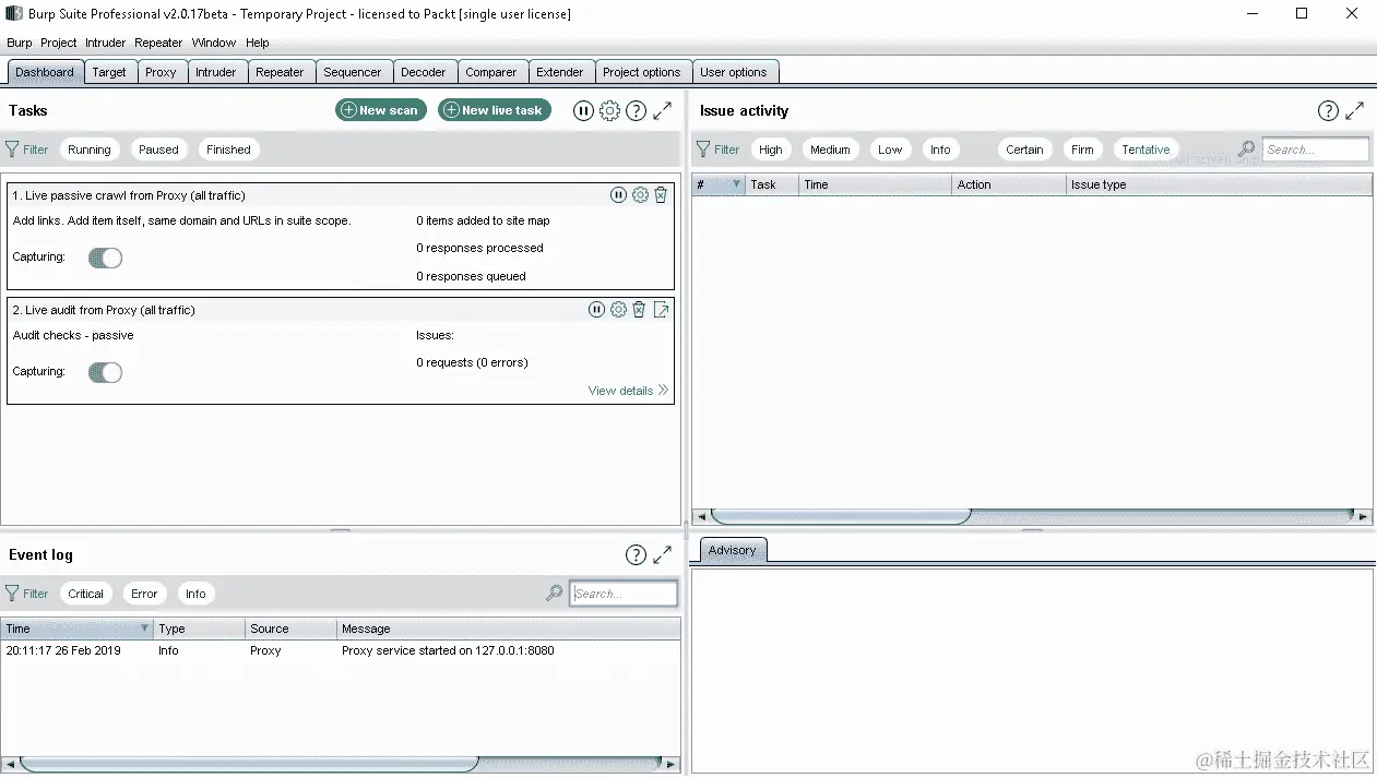 - 要启动扫描,打开 Burp Suite,转到主仪表板,然后单击新扫描: