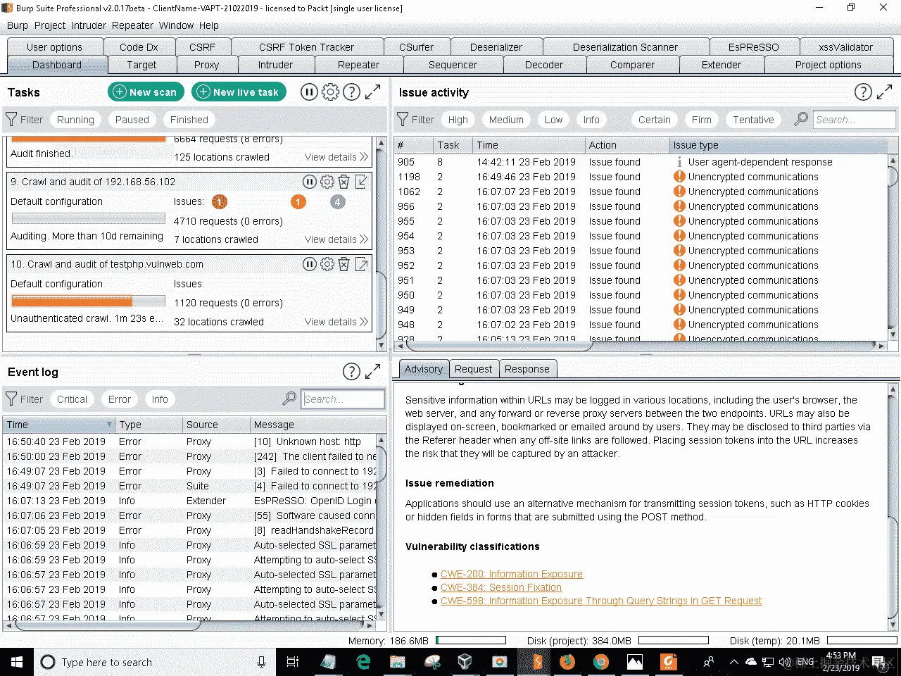 在测试期间处理应用程序错误选项卡中,可以配置 Burp Suite 在检测到错误时采取的操作。这些选项可以帮助我们在必要时停止扫描。例如,目前通常有一些应用程序托管在云服务中。云服务非常擅长阻止扫描活动,因此很可能如果我们正在测试托管在云中的网站,在测试几分钟后,我们的 IP 地址将被阻止,Burp Suite 只会收到超时错误。我们可以在出现这种类型的错误时停止扫描。