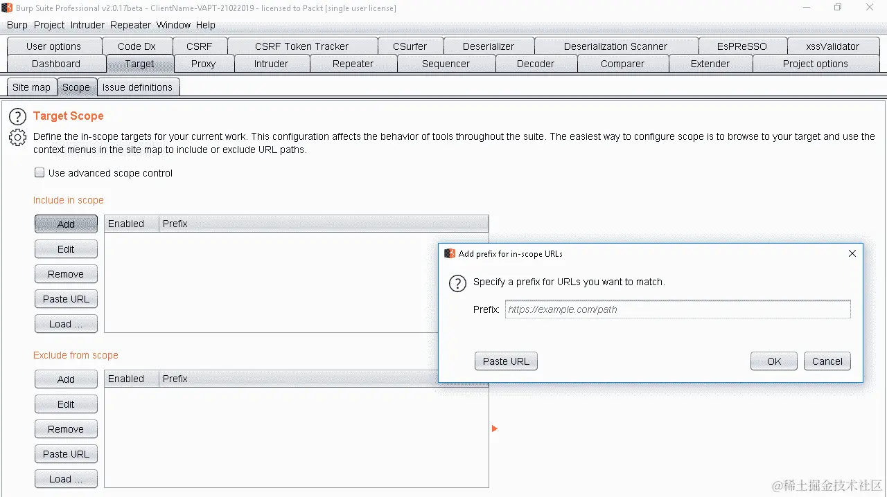 - 为了避免这种情况,Burp Suite 可以扫描这些其他应用程序;点击详细范围配置。在这里,我们将看到两个名为包括前缀选项和排除前缀选项的选项卡。转到第二个选项卡,排除前缀选项,并输入我们不想测试的应用程序,如下所示: