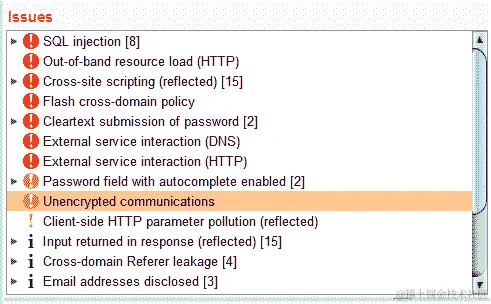 下一部分,报告的问题,是用于选择扫描策略。Burp Suite 默认情况下已经按类别划分了可能的问题。但是,您也可以按类型选择。例如,对于这个练习,我们只选择 SQL 注入漏洞。这对于修复或验证错误非常有用,例如: