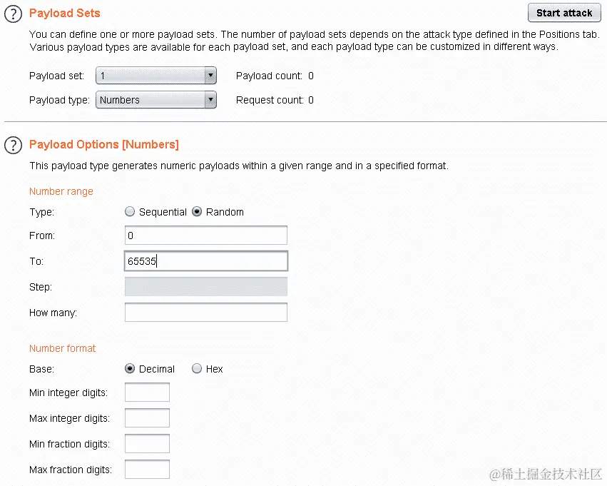 想象一下,你想要在运输网站上知道一个包裹的追踪号码。点击“有效载荷”选项卡,选择“数字”选项作为有效载荷类型。我们需要注入一系列数字,从 0000000000 到 9999999999,依次注入,如下所示: