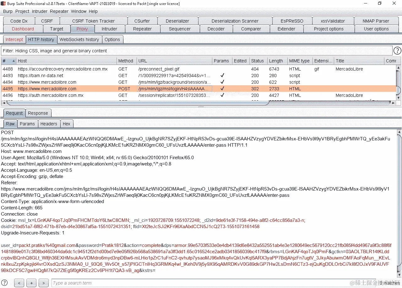 使用注销选项关闭会话,然后转到历史记录,查找用户登录时进行的请求。右键单击发送到重复器,然后在不修改任何值的情况下,单击Go重新发送请求,如下所示: