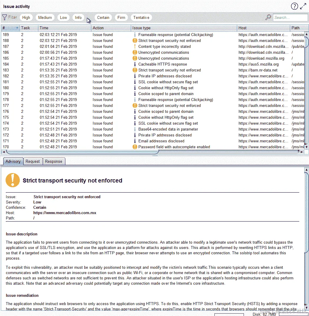 仅使用被动扫描,也就是没有侵略性的操作,Burp Suite 就检测到用户可以强制应用程序在不受保护的通道中使用。这意味着用户可以强制使用 HTTP 协议而不是 HTTPS 协议,并以明文发送信息。这可能会被恶意用户利用,结合其他漏洞来窃取用户信息,如下例所示: