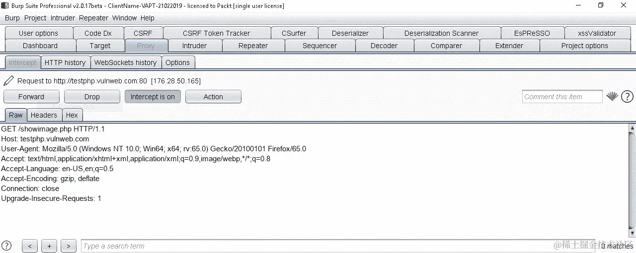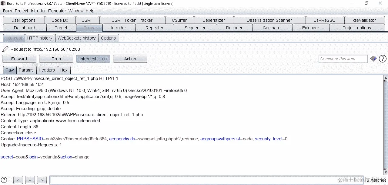 在以下的截图中,你有一个易受攻击的应用程序,并且你已经拦截了下一个请求: