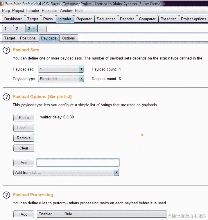 - 在 Intruder 中,为了快速测试,将延迟查询添加为唯一的有效负载,然后启动到所有参数,如下所示: