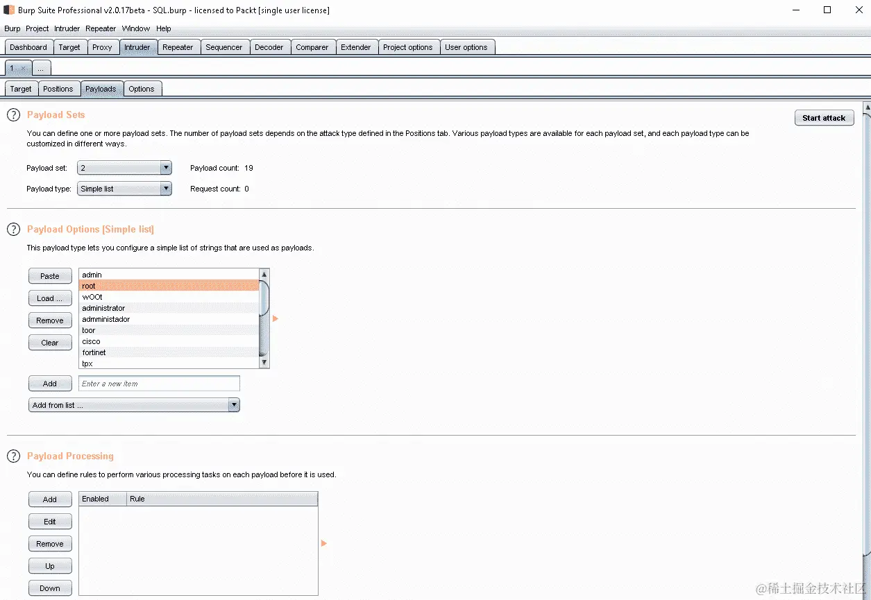 要识别正确的内容,您只需将它们作为 Intruder 中的有效负载加载并启动应用程序,我们将在本章中更详细地介绍。
