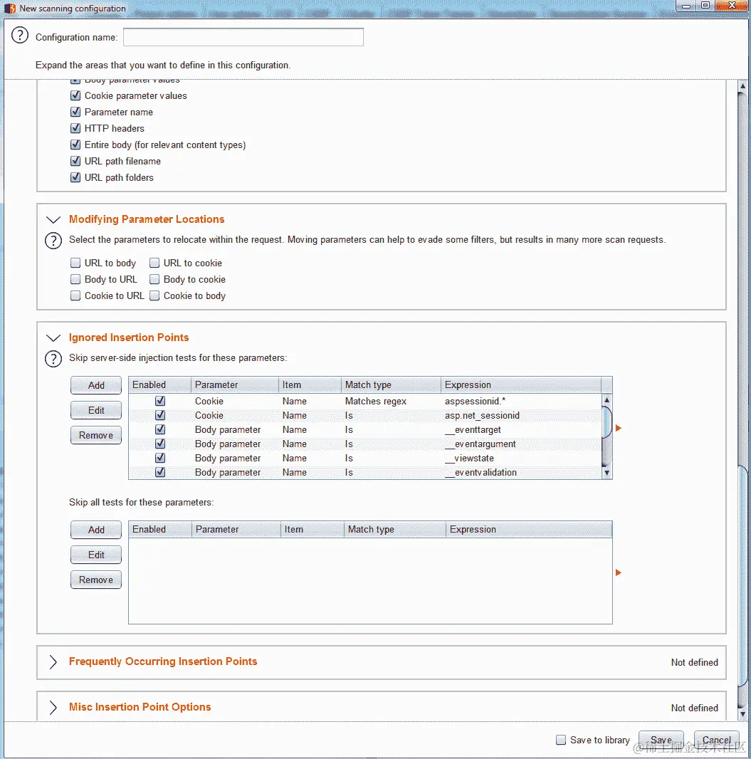 在插入点类型中,可以定义要注入测试字符串的位置。例如,您可以将测试限制在 URL 参数、cookies 等。根据我的经验,最好测试所有可能的入口点。