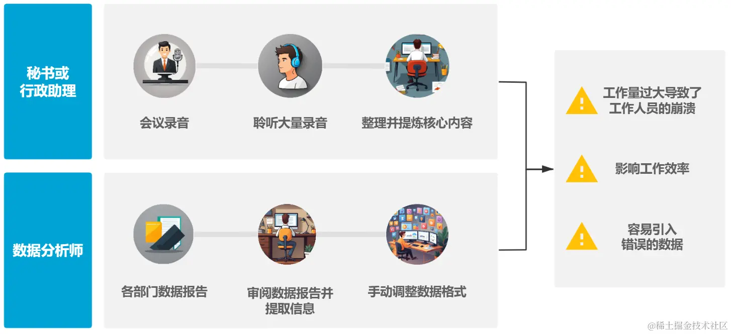 在职场中,秘书和行政助理们需要负责从冗长的会议录音中提炼核心内容,梳理参与者和议题等关键信息。与此同时,数据分析师则审阅各部门数据报告,提取对决策至关重要的信息。