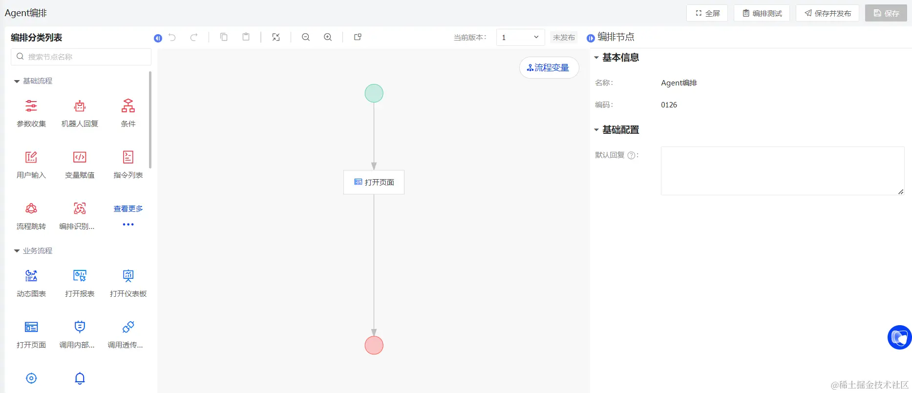 打开页面节点支持打开内部页面或外部页面,并支持维护页面的打开方式和页面参数。