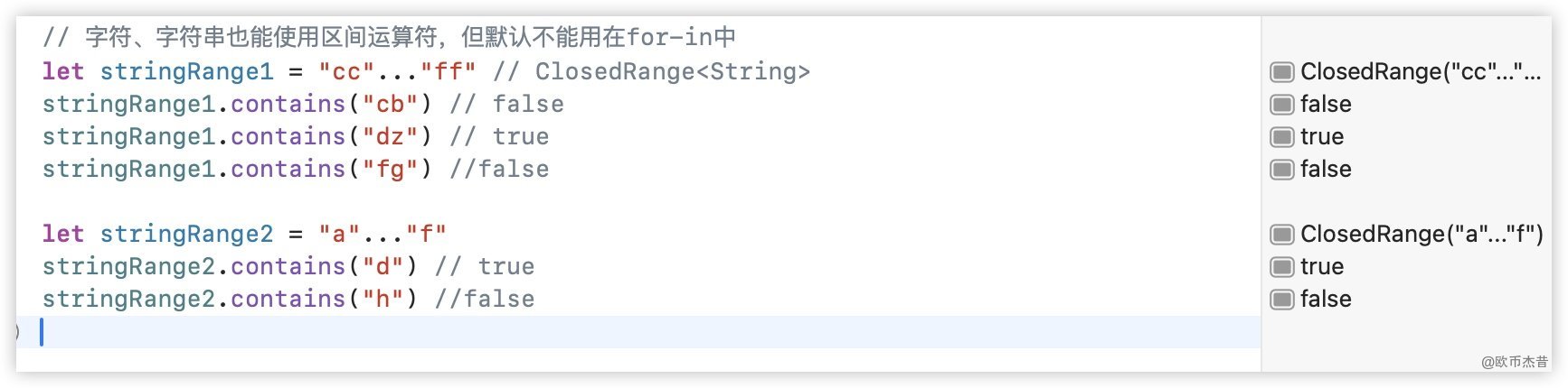 字符、字符串也能使用区间运算符,但默认不能用在for-in中