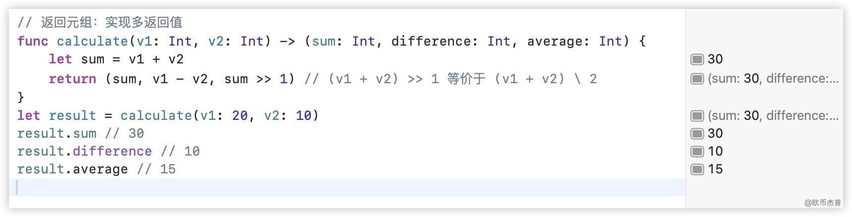 func calculate(v1: Int, v2: Int) -> (sum: Int, difference: Int, average: Int) {