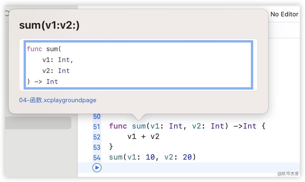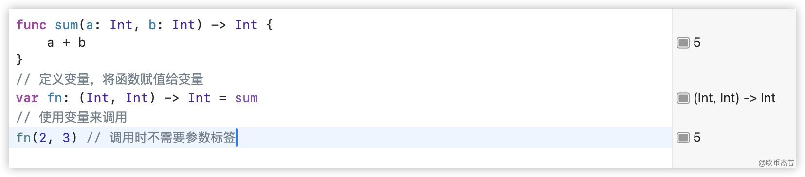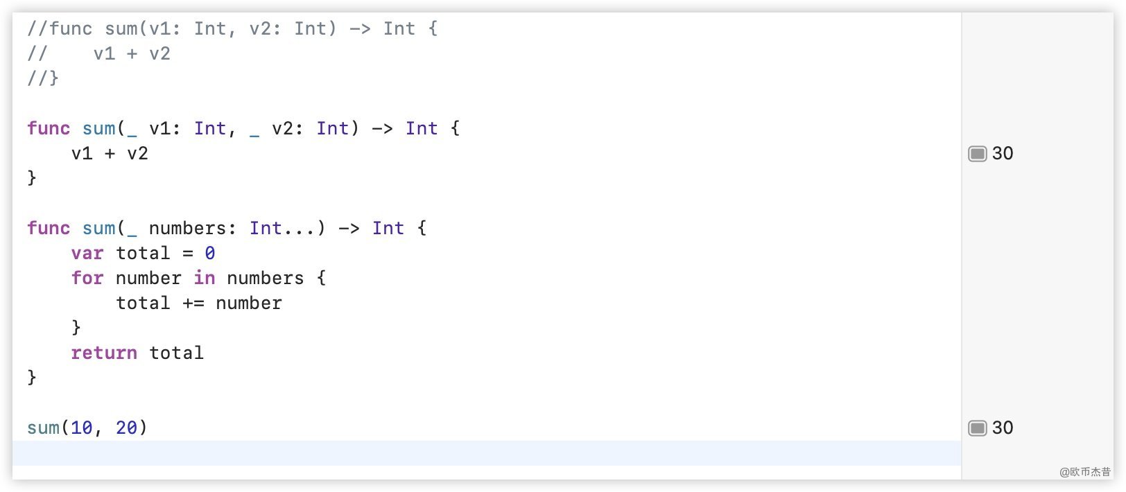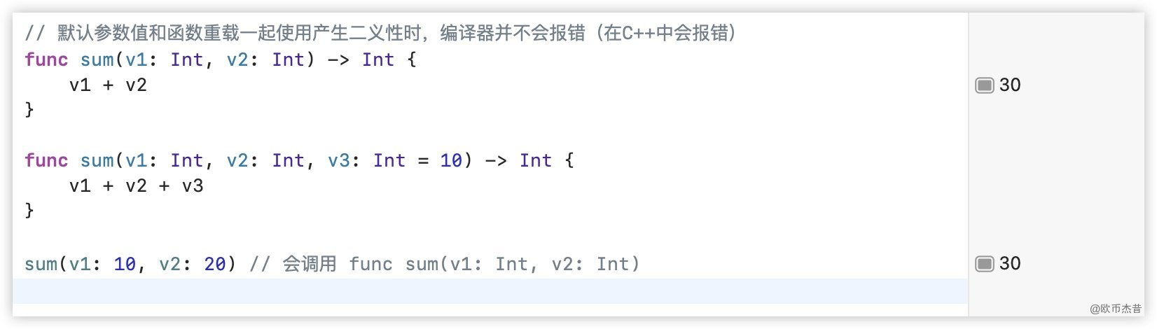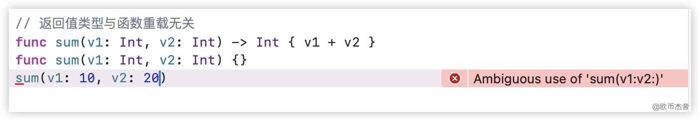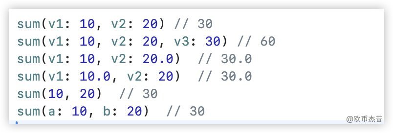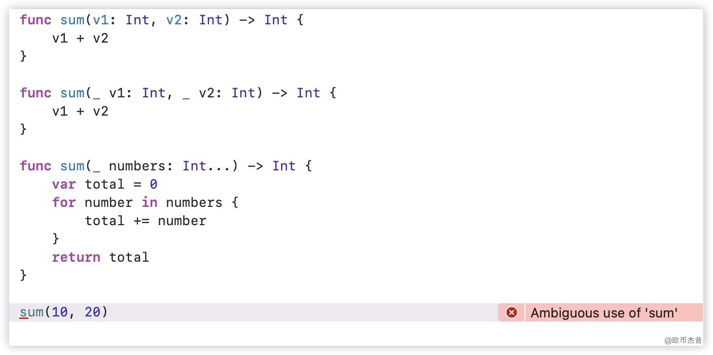 sum(v1: 10, v2: 20) // 会调用 func sum(v1: Int, v2: Int)