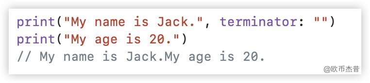 terminator: String = "\n",打印完所有参数后,要打印的字符串。默认是换行"\n"