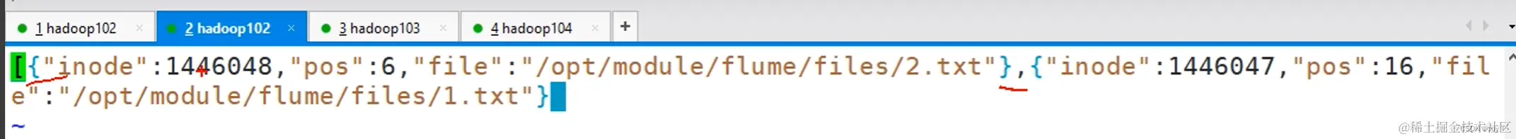positionFile原本是默认创建新目录的,为了方便可以修改配置文件直接更换positionFile的位置,这个文件中记录了监控的文件,每一个都包含绝对目录和inode文件唯一标识,pos是核心表示字节偏移量,根据这个偏移量实现断点续传的位置搜索,所以如果将文件改名,或者使用vim编辑(vim是先将原本文件删除然后再新建一个文件),Flume都会重新读取文件的所有内容。 此时断点续传所依赖的positionfile中的文件inode会不一样,(如果是改名的话inode和file路径都会不一样)表示新的文件。