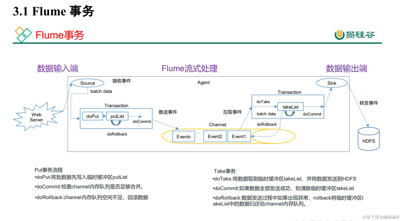put事务会提交失败。在这种情况下,事务会被回滚,这意味着数据不会被放入 Channel,并且 Source 需要重新尝试这个操作。这里的“回滚”指的是事务的回滚,而不是数据本身被回滚或删除。换句话说,事务的回滚意味着尝试放入数据的操作被取消,数据保持在 Source 端,等待下一次尝试。 - 重试机制:在实践中,Source 会不断重试