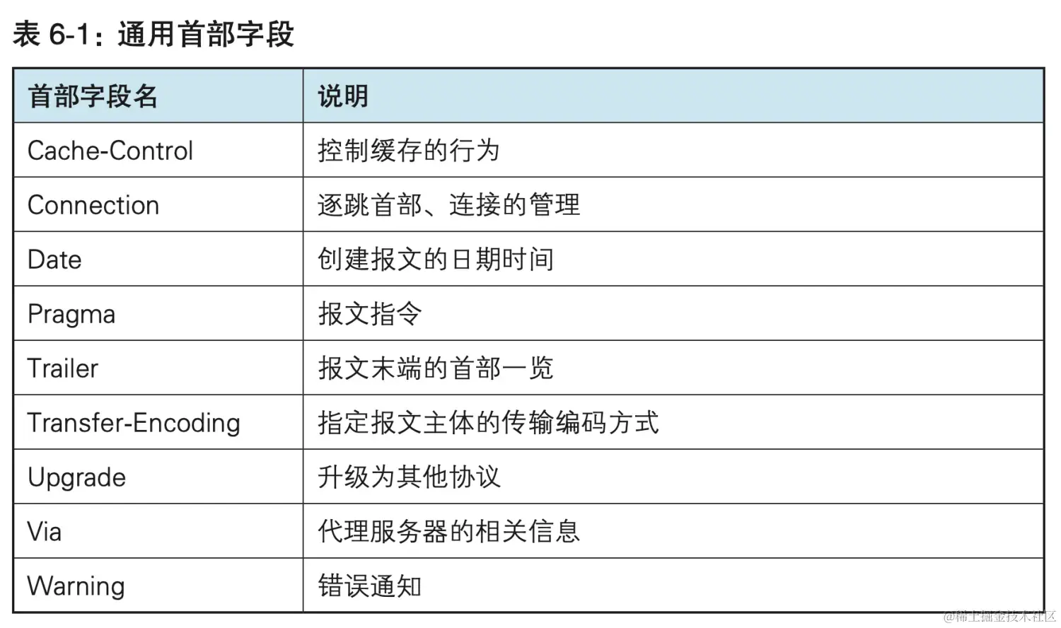 下面列举了 HTTP/1.1 中的逐跳首部字段。除这 8 个首部字段之外, 其他所有字段都属于端到端首部。