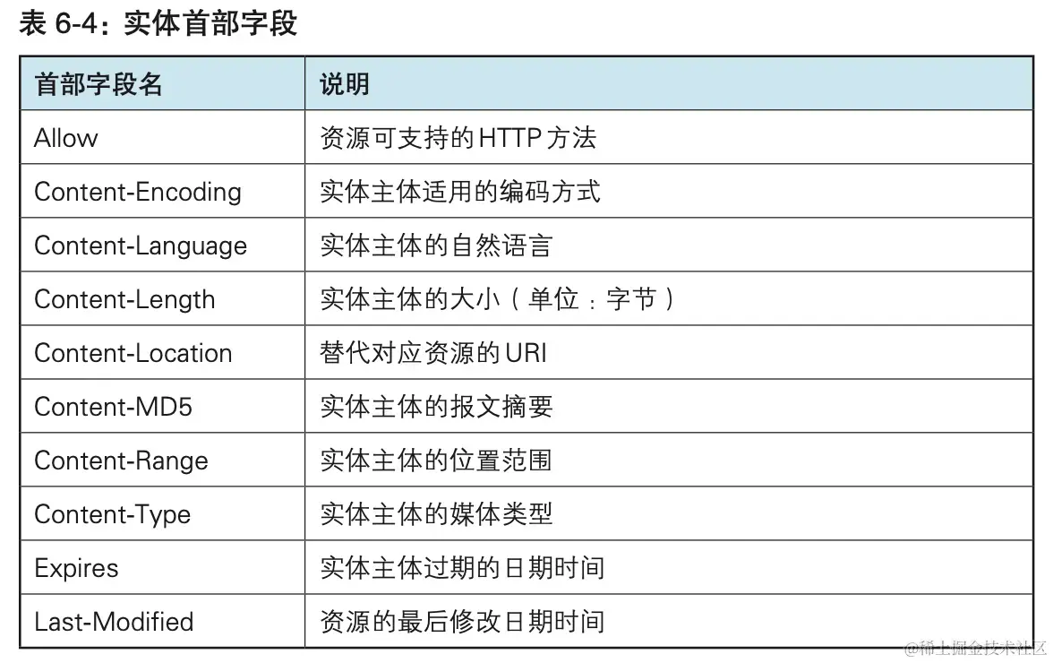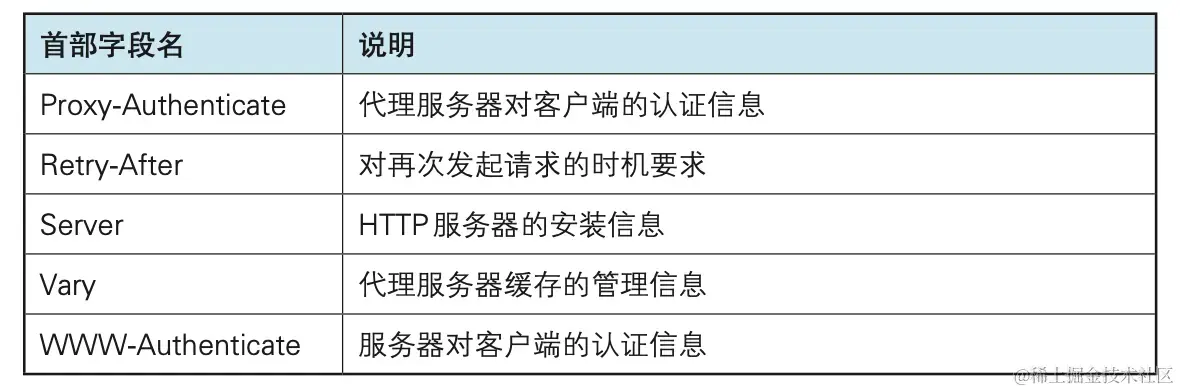 从服务器端向客户端返回响应报文时使用的首部。补充了响应的附 加内容,也会要求客户端附加额外的内容信息。