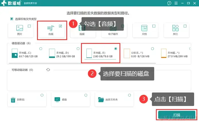 第1步:打开软件后,可以先勾选上 【音频】,并勾选上文件删除前所在的磁盘,点击【扫描】;