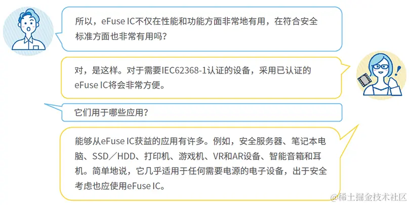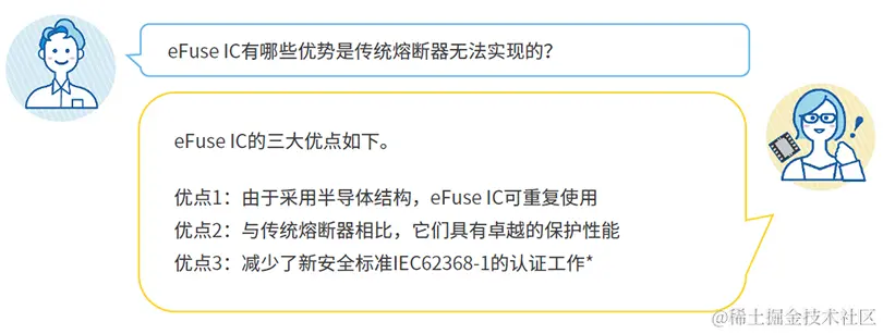 电子保险丝/熔断器是集成电路(IC)。MOSFET用于电压-电流检测电路、控制电路和电流通路的通断。因为它们是集成电路,所以在紧凑的封装内集成了许多高精度和快速响应的功能模块,包括过流、过电压、短路、过热保护等。传统的保险丝基本上只是切断电流通路,而电子保险丝却能提供许多保护和控制功能,从而能更容易地获得IEC62368-1认证。电子保险丝能够克服传统保险丝的相关缺陷。