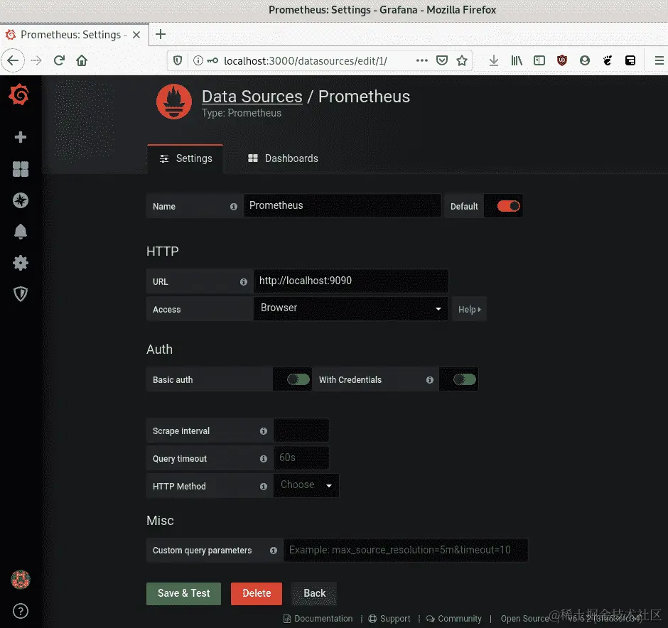 登录后,我们点击页面顶部的添加数据源,并在下一页选择 Prometheus。然后输入我们的本地 IP 地址并点击保存并测试。如果一切正常,我们应该在屏幕底部看到数据源正在工作的弹出窗口: