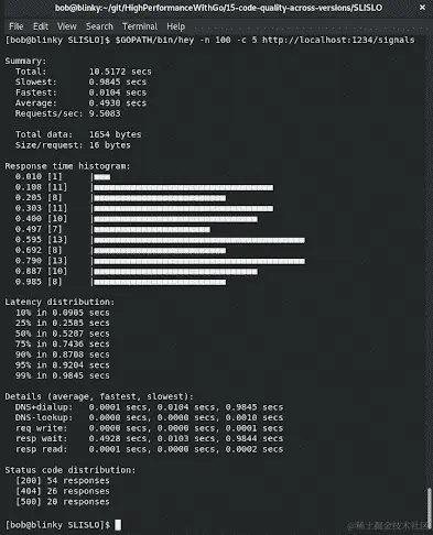 go run SLISLO.go启动 HTTP 服务器后,我们可以向我们的 HTTP 服务器发出hey请求。hey调用的输出在以下截图中可见。请记住,这些都是随机值,如果您执行相同的测试,结果将不同: