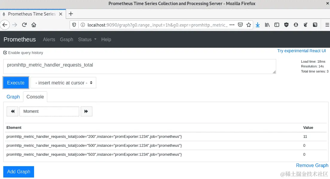 现在我们在本地环境上运行了一个 Prometheus 实例。