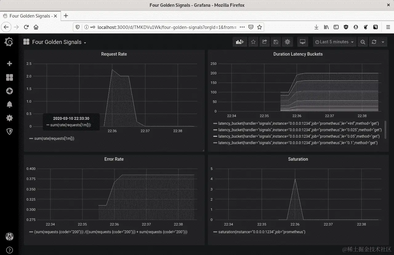 我们可以将所有这些黄金信号封装到 Grafana 仪表板中。我们可以通过调用在本地运行 Grafana 来运行 Grafana: