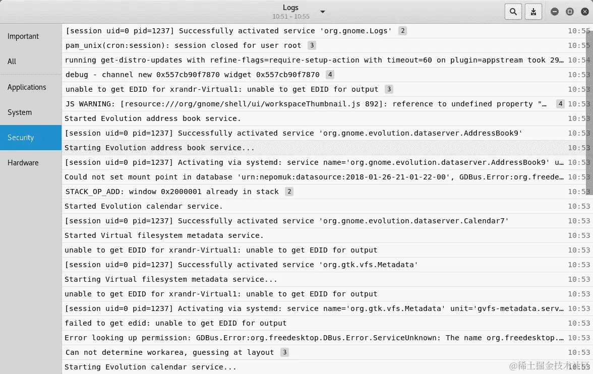 Kali Linux 生成并存储各种类型的日志,如应用程序、系统、安全和硬件。这些日志对于调试和跟踪事件非常有用。可以通过打开位于应用程序 | 常用应用程序 | 实用程序 | 日志的日志应用程序来查看日志,结果如下截图所示: