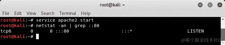我们可以使用 netstat -an | grep ::80 命令来验证服务是否成功启动: