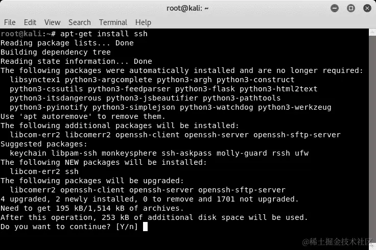 在 Kali Linux 中,我们可以通过首先安装 SSH 包来开始使用 SSH。可以使用 apt-get install ssh 命令,如下截图所示:
