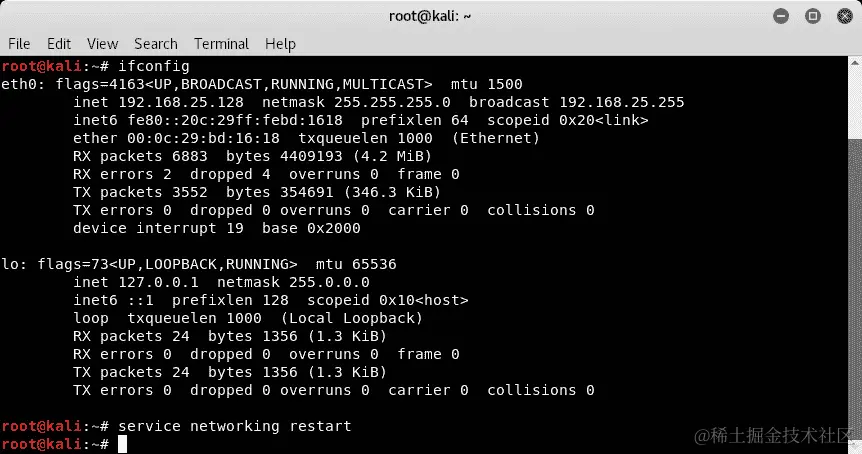 Kali Linux 广泛用于网络和应用程序渗透测试。因此,重要的是 Kali Linux 连接到网络,因为独立的 Kali 安装没有太多用处。确保网络连接的第一步是检查 Kali 是否有有效的 IP 地址。我们可以使用ifconfig命令,如下图所示,并确认 IP 地址分配: