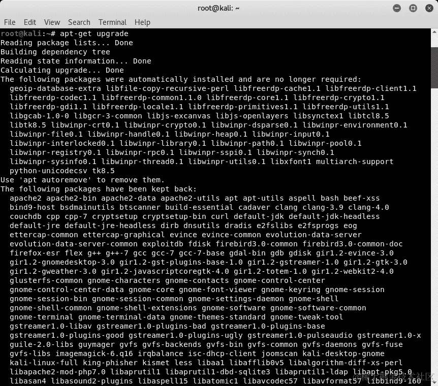 Kali Linux 也会定期获得重大的构建更新。为了升级到最新可用的构建,可以使用 apt-get upgrade 命令,如下截图所示: