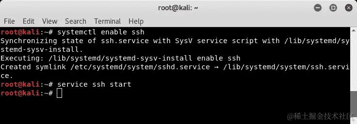 为了确保 SSH 在重新启动后自动启动,我们可以使用 systemctl 命令,如下截图所示,可以使用 service ssh start 命令启动 SSH 服务: