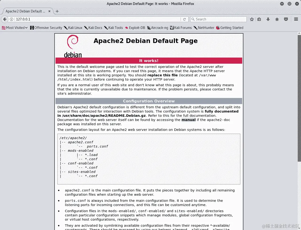 现在 Apache 服务器已经运行起来了,我们也可以通过浏览器进行验证。通过访问本地主机 (127.0.0.1),我们可以看到默认的 Apache 网页,如下截图所示: