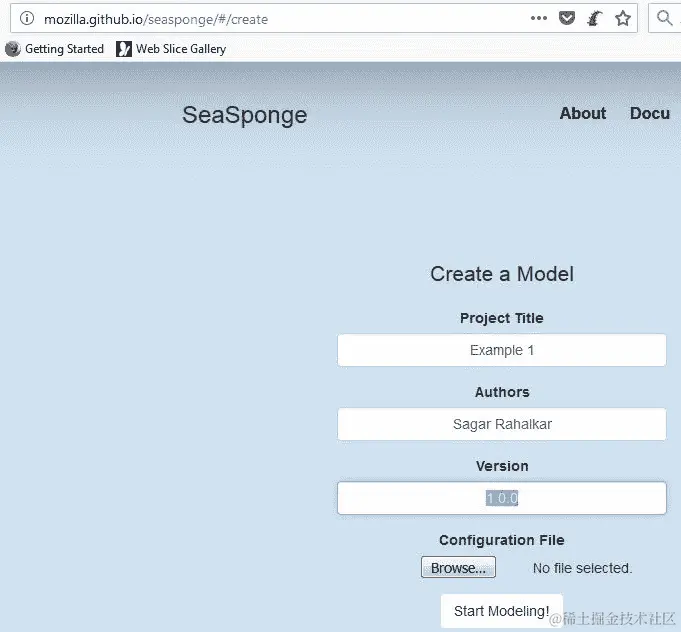 以下屏幕截图显示了 SeaSponge 在线工具的第一个屏幕。我们可以通过单击“创建模型”来开始创建一个新模型: