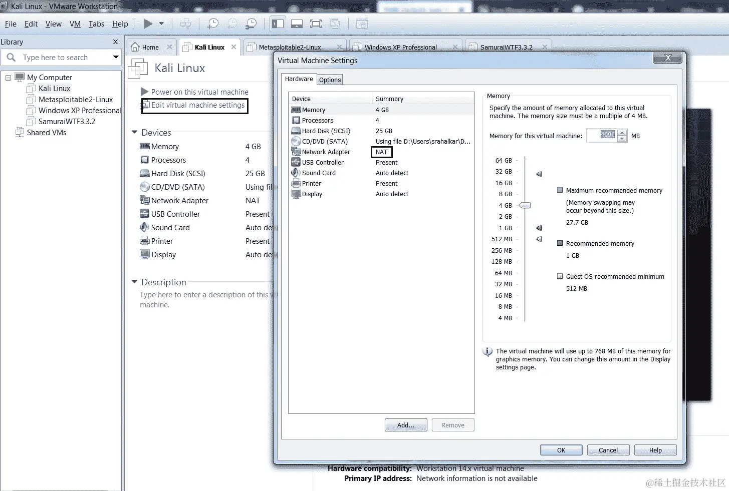 以下屏幕截图显示了 Kali Linux 在 VMware 中的情况。您可以通过选择“编辑虚拟机设置”选项来配置机器设置,分配内存并选择网络适配器类型。完成后,您可以简单地启动机器: