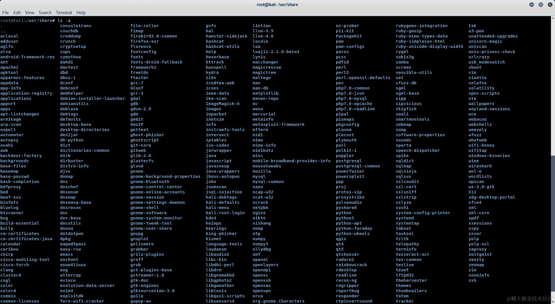 Kali Linux 配备了大量有用的工具和实用程序。有时,我们需要对这些工具和实用程序的配置文件进行更改。所有工具和实用程序都位于 /usr/bin 文件夹中,如下截图所示: