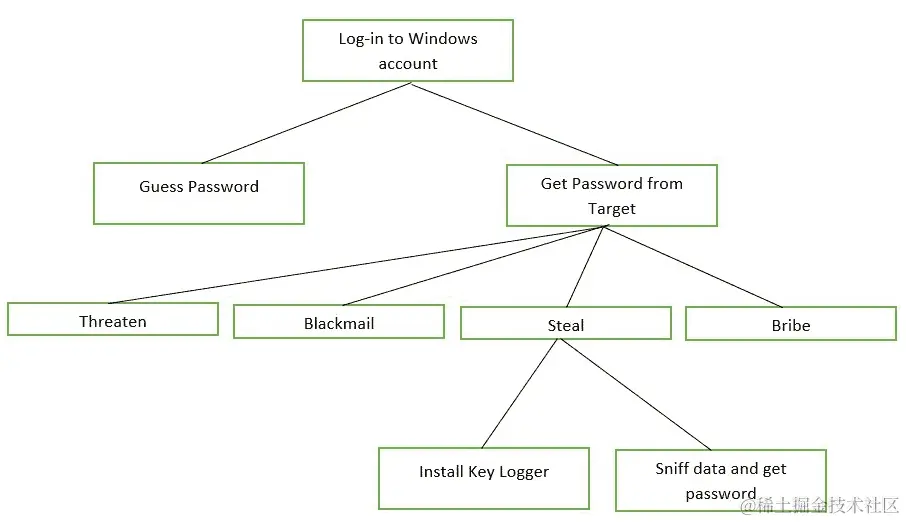 攻击树: 攻击树以可视化方式展示了成功攻击或损害目标的各种路径。以下图表显示了获取对 Windows 系统访问的样本攻击树: