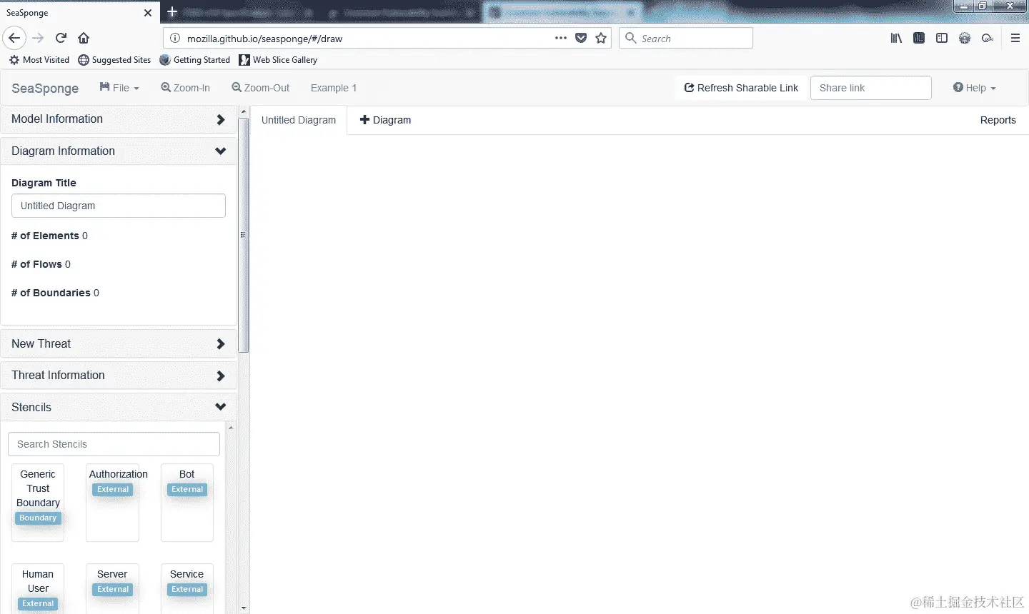 单击“创建模型”开始设计新的威胁模型,如下屏幕截图所示。您将看到一个空白画布,可以继续设计: