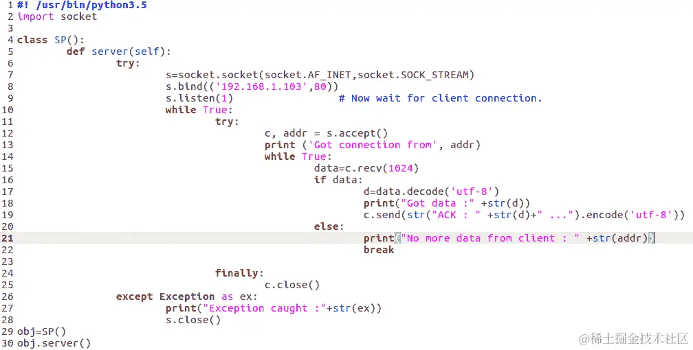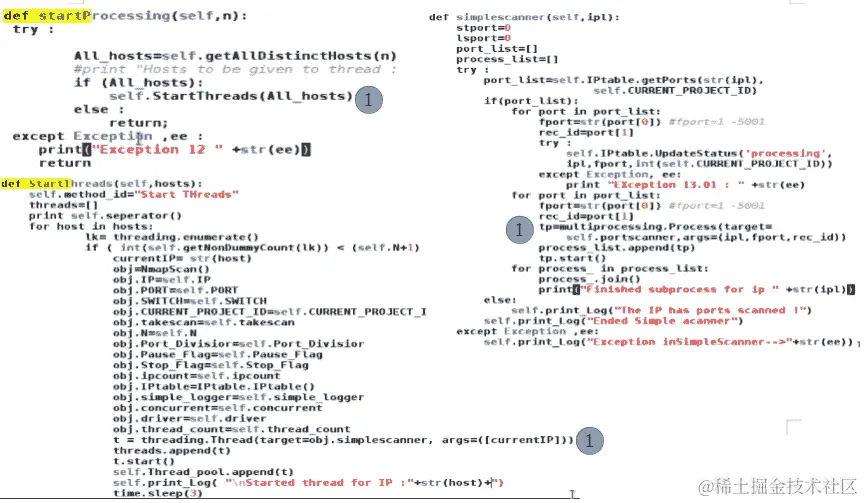 startThreads()方法很简单。我们遍历主机列表并为每个主机分配一个线程,通过调用obj.simplescanner方法并将当前 IP 列表传递给它。对于我们当前的示例,simplescanner方法将被调用两次。首先,它将为线程 1 调用,该线程具有 IP 地址192.168.250.143,然后它将为线程 2 调用,该线程具有 IP 地址192.168.250.144。这由代码片段**(1)**突出显示。